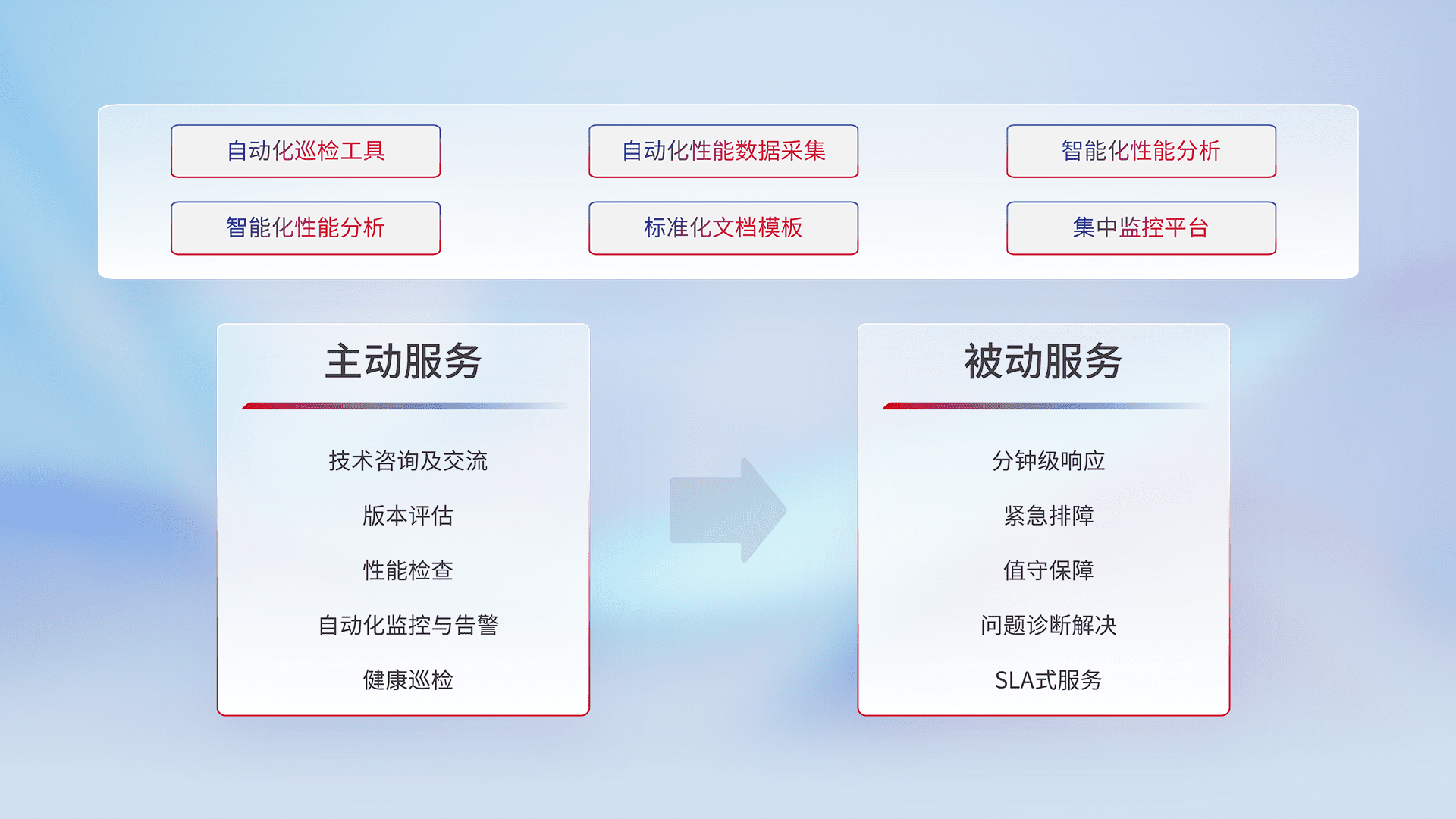 智能化工具和标准化文档,,保障服务质量,,,提供主动服务(包含技术咨询、、、版本评估、、、性能检查、、自动化监控与告警、、、、健康巡检)和被动服务包含(分钟级响应、、、、紧急排障、、、值守保障、、、、问题诊断解决、、SLA服务)。。
